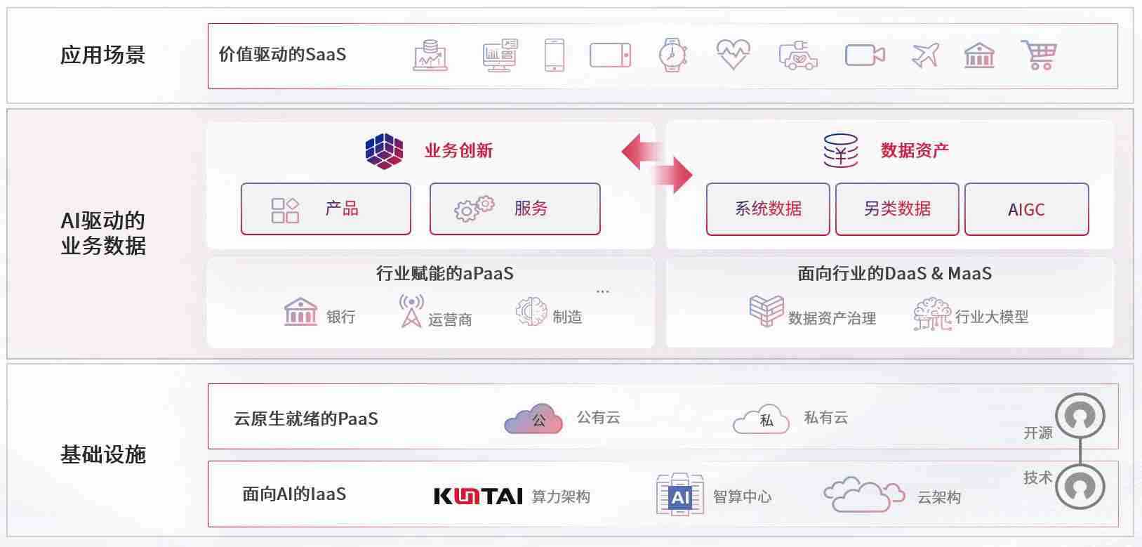 数字时代,,围绕企业数字化转型的关键要素,,,太阳成tyc33455cc数码开创性的提出数云融合战略和技术体系框架,,,,着力在云原生、、、、数字原生、、、AI原生和信创产业上架构产品和服务能力,,,为处在不同数字化转型阶段的快消零售、、汽车、、金融、、、、医疗、、、政企、、、教育、、运营商等行业客户提供泛在的敏捷IT能力和融合的数据驱动能力,,构建跨界融合创新的数字业务场景和新业务模式,,,,助力企业级客户建立面向未来的核心能力和竞争优势,,,全面推动社会的数字化、、、、智能化转型升级。。