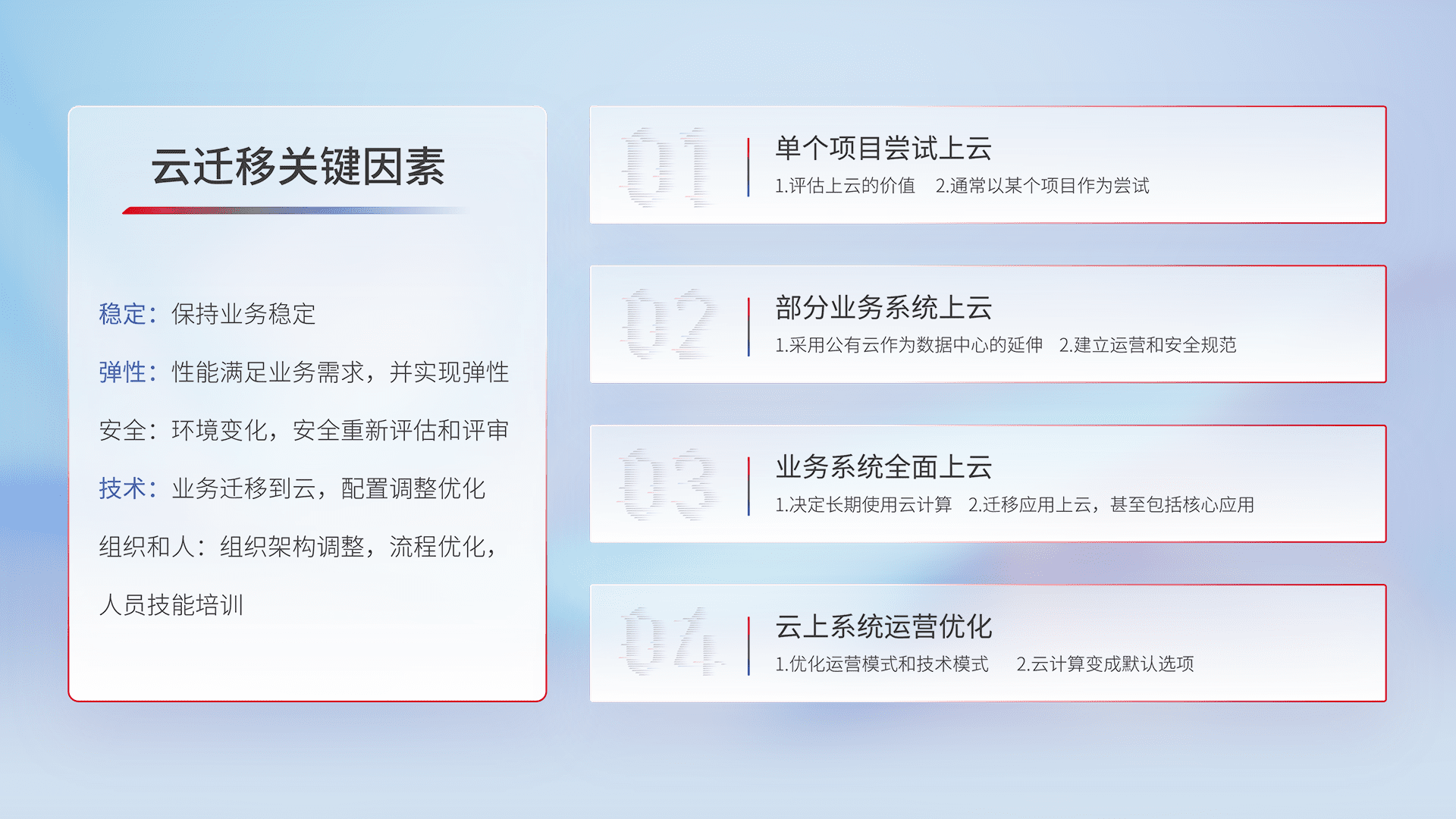 结合实际业务,,,从规划设计、、云平台选型、、、云原生改造、、、数据迁移、、、集成交付,,,,迁移全过程为客户识别最佳上云路径,,,做好风险识别管理,,,,设计网络架构、、身份权限、、、安全审计合规、、、、操作审计、、日志审计、、、、监控告警策略、、、、多站点容灾设计等,,,对云上基础设施进行整体规划,,提升IT治理水平,,以满足弹性、、、高可用、、、高性能的需求。。。。