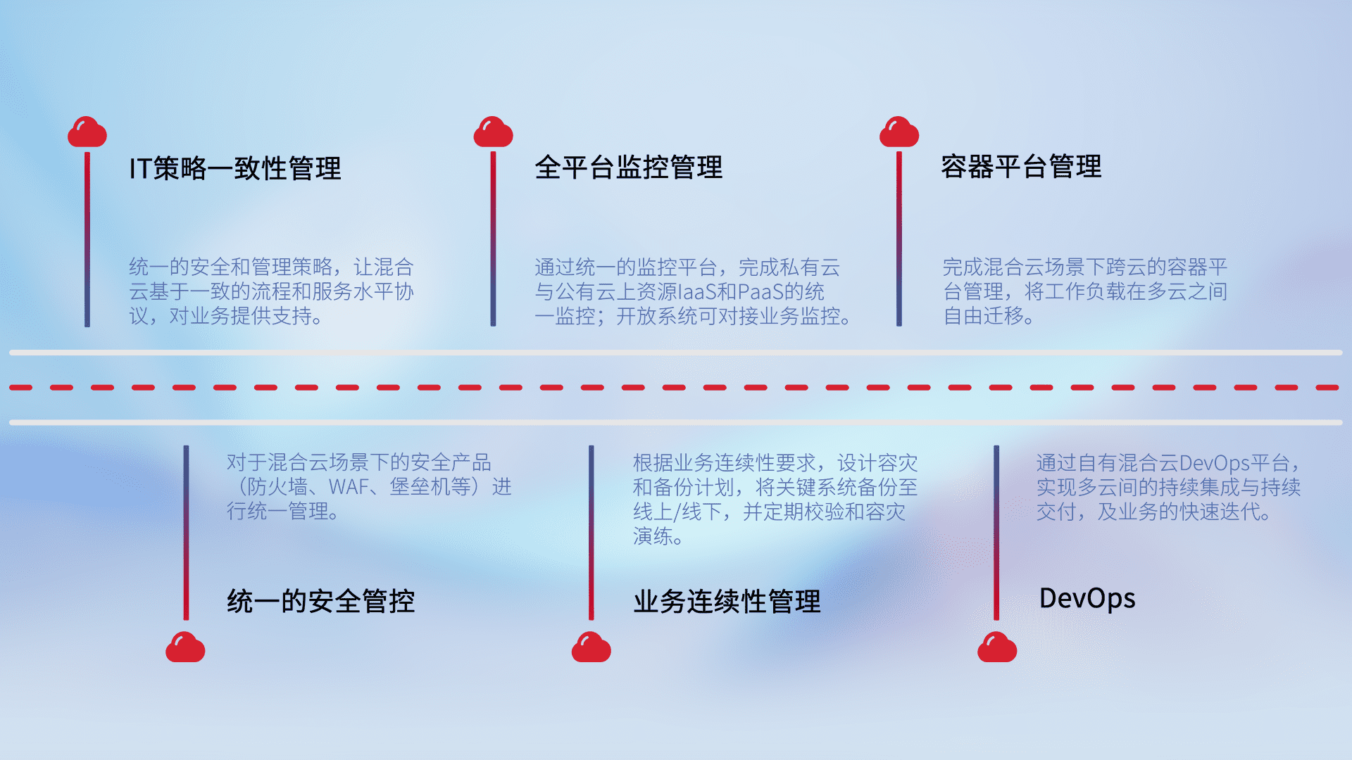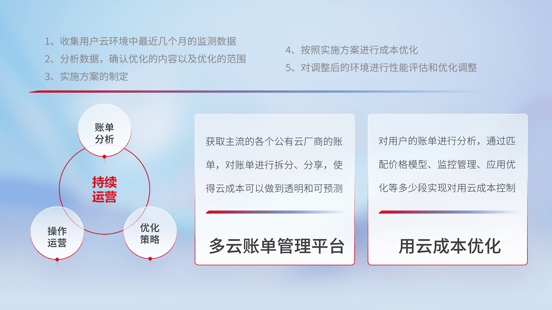 通过多云纳管,,,以统一的资源数据模型把客户的云资源进行抽象和封装,,进而实现对多云资源的统一操作,,,保障云资源管理的可靠性、、、稳定性与可用性。。。量身定制化运维内容,,配置、、、、开发运维、、、补丁管理、、、备份、、、、监控、、、、认证和访问管理、、、审计和日常巡检等,,,保障在用云过程中的可靠度,,,,稳定度以及高可用率。。。。